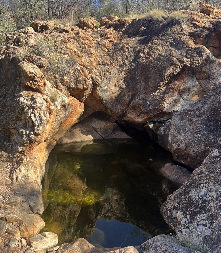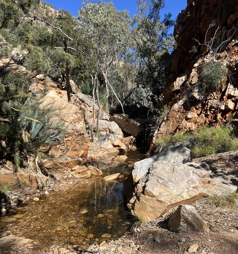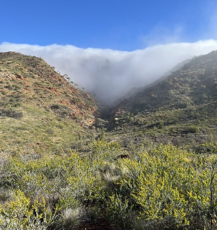 Today exposed me to some epic scenery walking in the valleys and creek bed towards Standley Chasm. First being the walk south between Mt Lloyd and the Chewings Range to Fish Hole then turning west again towards Tangentyere Junction for the high route. As I walked the clouds started to lift creating incredible scenes as many of the hill tops were still covered in clouds.